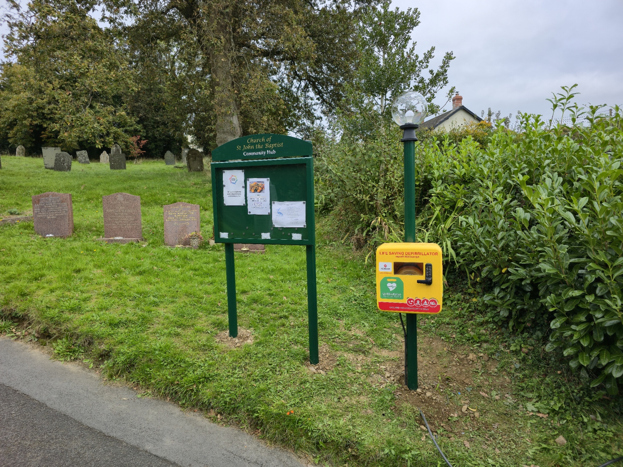 The defibrilator is located near the Meshaw Community Hub at St John The Baptist Church EX36 4NE.