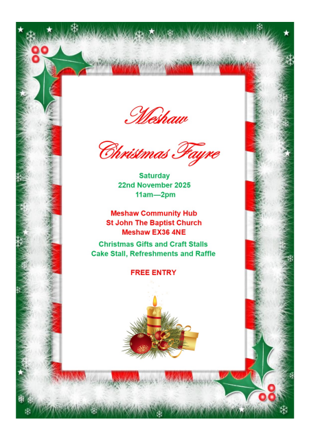 Followed by mulled wine and mince pies and a Christmas hamper draw in Meshaw Community Hub.